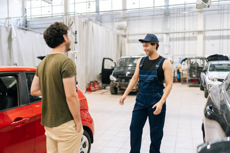 Positive automotive mechanic male in explaining car condition to man client in garage. Friendly vehicle service manager work in workshop point at vehicle part to customer for maintenance