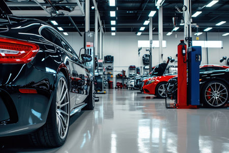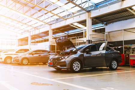 car in automobile repair service center with soft-focus and over light in the background
