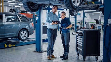 Manager Checks Diagnostics Results on a Tablet Computer and Explains a Vehicle Breakdown to a Handsome Mechanic. Car Service Employees Talk while Standing in a Garage. Modern Clean Workshop.
