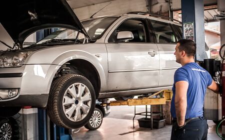 Lifted car in professional service - the collapse of convergence - process repairing, defocused background