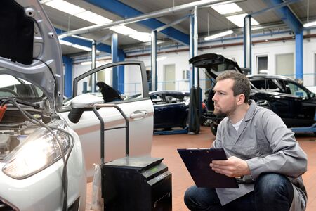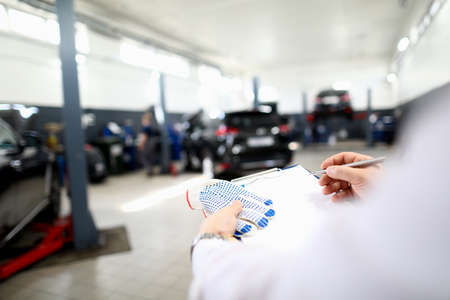 Young car mechanic holding clipboard and inspecting checklist while examining vehicle in auto repair shop, performing quality control and maintenance procedures