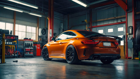 Close-up of a sports car in a repair shop. Car service concept.
