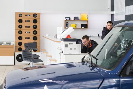 Transparent film, car paint protection, wrapping specialis. Car detailing. Selective focus.