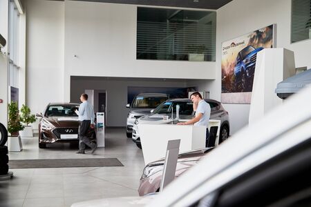 Petrozavodsk, Russia - June 21, 2019: Managers in showroom with cars of dealership Hyundai in Petrozavodsk city in Russia