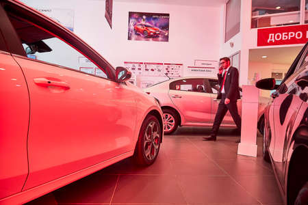 Kirov, Russia - March 06, 2018: Manager in showroom of dealership russian car plant AVTOVAZ named SeverAvto in Kirov city in 2018