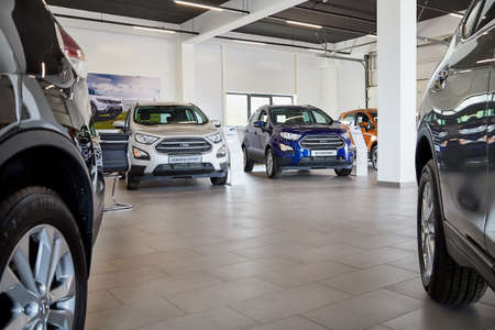 Murmansk, Russia - June 21, 2019: Cars in showroom of dealership Ford in Murmansk city in Russia