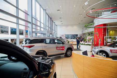 Murmansk, Russia - June 21, 2019: Cars in showroom of dealership Toyota in Murmansk city in Russia