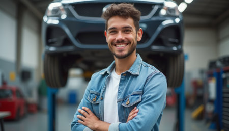 A young man with curly hair stands confidently in a car workshop, arms crossed, smiling brightly. The backdrop features a car elevated on a lift, showcasing a vibrant and industrious atmosphere filled with tools and equipment.