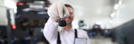Close-up view of mechanic giving car key to client in service station. Well done job and automobile maintenance concept. Worker in uniform with clipboard checklist paper