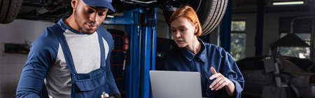 Workwoman holding laptop near african american colleague with wrench in car service, banner