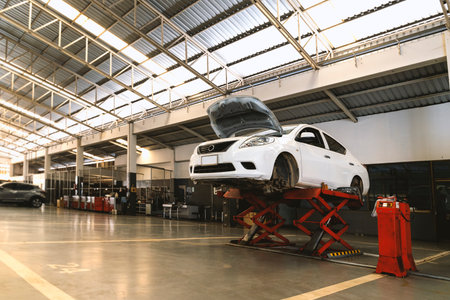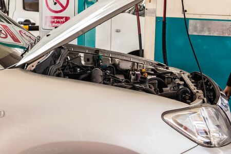 Bangkok / Thailand - December 30, 2016: White car in maintenance in garage service station. Car service, repair, maintenance concept.