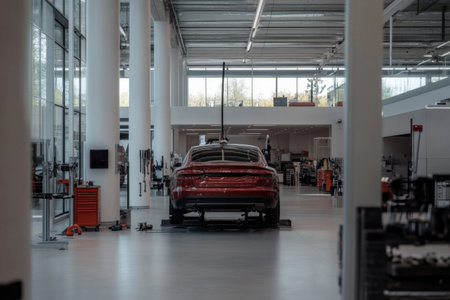 A sleek red car is positioned on a lift in a contemporary auto repair shop featuring spacious areas, tall ceilings, and ample natural light from large windows.