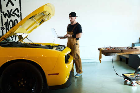 Young mechanic in workwear holding laptop during technical diagnostics of engine and other details of electric car of yellow color