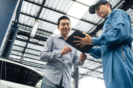 Asian automotive mechanic explain car condition to client in garage. Vehicle service manager male work in mechanics workshop point at vehicle part to customer man for maintenance and repair car engine