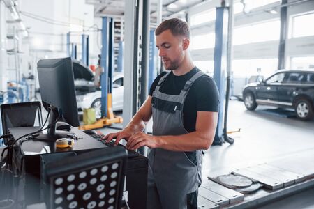 Typing on keyboard. Man at the workshop in uniform use computer for his job for fixing broken car.