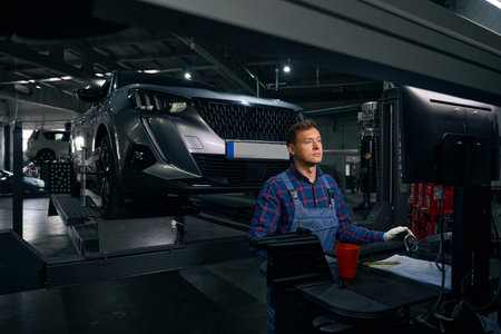 Mechanic in a workshop checks and inspects a vehicle for defects