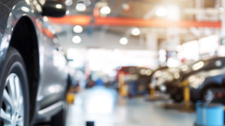 car service centre with auto at repair station bokeh light defocused blur background