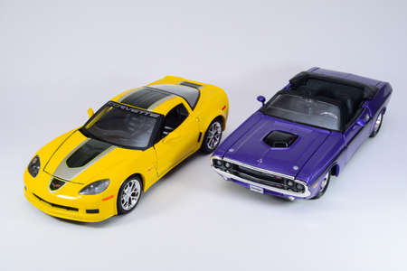 Odessa, Ukraine - May 9, 2021 - Collectible car toy Mercedes-Benz C63 AMG on luminous background. Top view