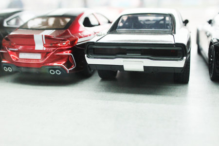 Many multi-colored toy cars on white background. The group of car toy. Small cars on white table, top view with copy space.