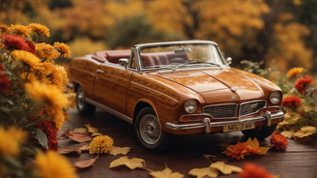 A classic copper-toned sports car gleams beautifully, its vibrant finish reflecting perfectly on a slick, wet surface. This moody shot captures the elegant design and nostalgic appeal of a vintage automobile.