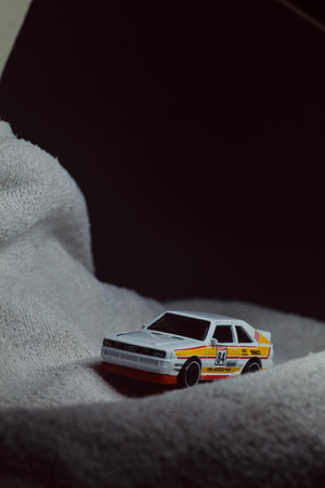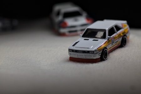 Mantua, Italy - 10TH JANUARY 2025 - Hot Wheels replica of a 1984 Audi Sport Quattro in rally livery and trim pretending to run a rally on a snowy road, next to a cliff, in the mountains