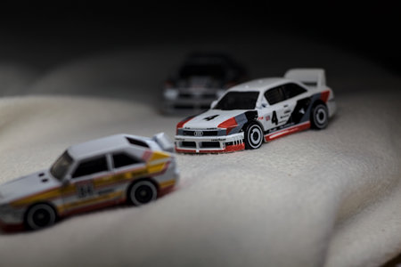 Mantua, Italy - 4TH JANUARY 2025 - Hot Wheels replicas of two Mazda 787B in race livery on white board, bordered by white rolls of fabric, pretending to make a curve on a road and having a race between them
