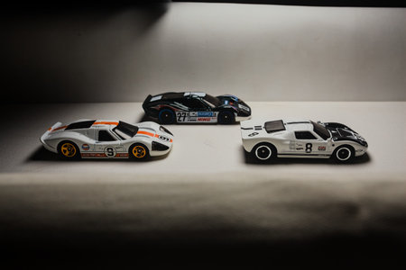Mantua, Italy - 28TH DECEMBER 2025 - Hot Wheels replicas of two Ford GT40 Mark IV, one in a green race livery, another in white and orange Gulf race livery, and a GT40 in black and white race livery pretending to have a race on a race track