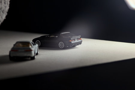 Mantua, Italy - 3RD JANUARY 2025 - Hot Wheels and Matchbox replicas of a 1989 Mazda Savanna RX-7 and a Mitsubishi 3000 GT on a white board, next to a gray piece of fabric, pretending to have a race on a mountain road by the edge of a cliff