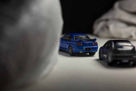 Mantua, Italy - 4TH JANUARY 2025 - Takara Tomy replicas of a Nissan Skyline GT-R V-Spec Nur II and a Mitsubishi Lancer Evolution on white board, bordered by white rolls of fabric, pretending to make a curve on a road and having a race between them