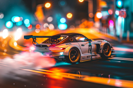 The sleek car glides through the bustling city streets at night, leaving a trail of smoke as it drifts around the corner