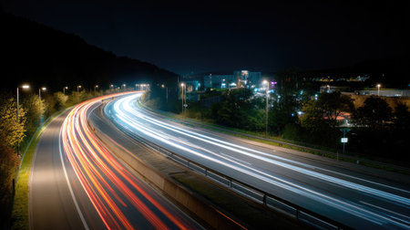 Captivating long exposure shot of a highway at night, showcasing vibrant light trails from vehicles against a serene urban backdrop.