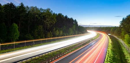 german highway at sunset with light trails from passing cars
