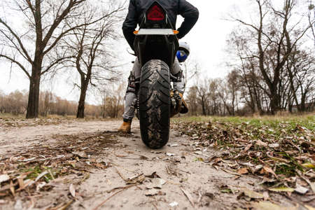 Studded cross motorcycle wheel on the ground level. Focus on the rear wheel. Details of a motorbike closeup. Traveling concept. Driving the empty road on a tour journey. Discover the beauty of earth.