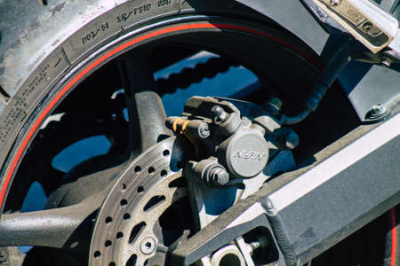 Seville Spain July 14, 2021 Closeup of the mechanics of a motorcycle parked in a parking lot located in the city center of Seville, an emblematic city and the capital of the region of Andalusia, in the south of Spain