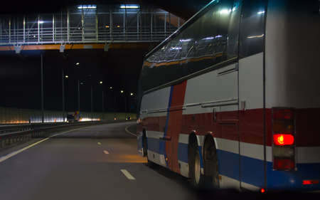 Touristic passenger bus on highway. Very fast driving. Tourism concept. 3d rendering.