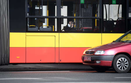 Warsaw, Poland, April 16, 2020: Warsaw during first day with hiding nose and mouth restriction during corona virus quarantine, people in public communication