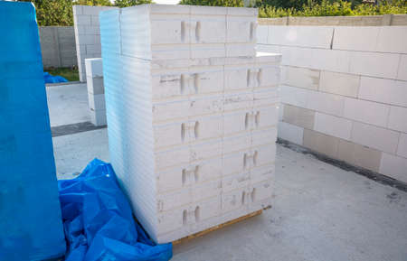 Aerated concrete blocks of light building material of white color piled on a pile for construction, texture closeup nobody.