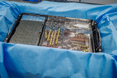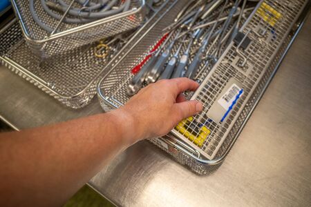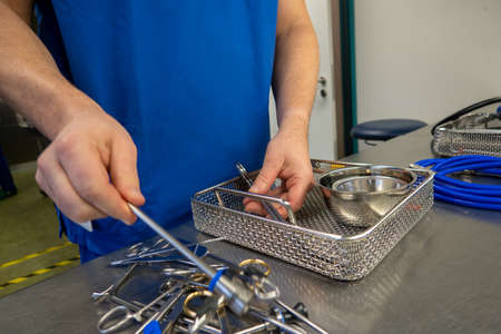 an employee of a hospital sterilization department sorts the cleaned instruments into a container