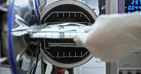 Sterilization of medical dental instruments in autoclave, close-up laboratory sterilizer in dentistry sterilization department of dental clinic