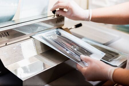 Dentist's assistant hands in gloves packing dental instrument set for autoclaving in a plastic bag using vacuum packing machine. Sterility and safety care concept