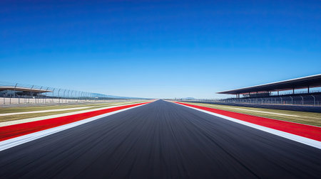 A stunning view down an empty racing track, featuring smooth asphalt and vibrant red lines under a clear blue sky, capturing the thrill of motorsport.