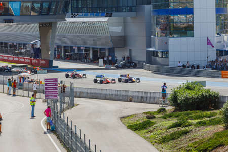 Sochi, Russia - APRIL 29, 2016: Renault drives along the track of the formula one. Marshals watch the movement