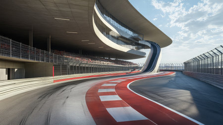A stunning view of a modern race track showcases unique architectural features and smooth asphalt curves, perfect for high-speed racing events under a bright sky.