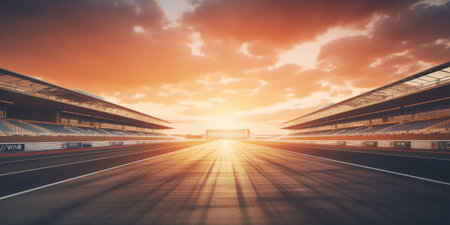 An empty race track is the focal point, leading the eye toward the vibrant sunset sky. The scene features stadium seating on either side, illuminated by artificial lighting. The composition and color palette suggest potential use for promoting racing events or illustrating competition themes.