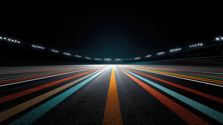 An atmospheric view of a racing track at night, featuring vibrant lane lines contrasting against the dark asphalt, illuminated by bright stadium lights creating a dynamic scene.