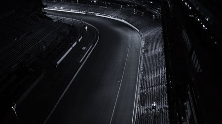 A lonely racetrack shot from above, surrounded by empty stands in the night