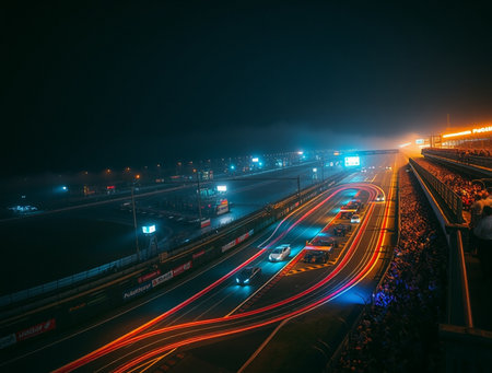 Dynamic scene of a race track at night, featuring light trails from fast-moving vehicles on an asphalt surface, creating an exhilarating atmosphere.