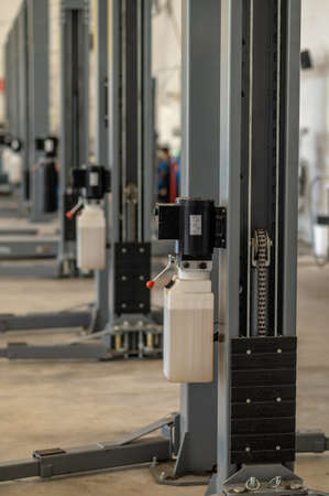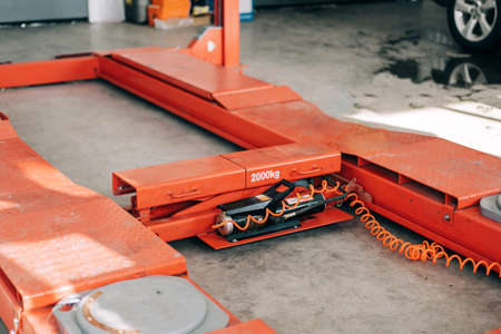 Orange car lift in a calm state for indoor use. Equipment at the service station for lifting machines.