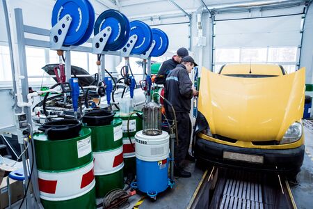 Vinnitsa, Ukraine - August 01, 2017. Service center in process of car maintenance