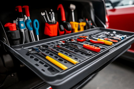 A selection of wrenches and pliers neatly organized in a workshop drawer highlights the importance of efficiency in vehicle maintenance. This setup aids mechanics in their daily tasks. Generative AI.